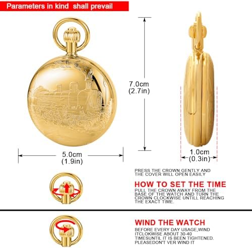 Features:Built-in mechanical hand-wound movement, Train Railroad mechanical,Train Railroad case,big London Roman Numbers,5 hands,two Sub-dials(Second&24hours). Looks very simple and fashion.Suitable for all types of people., it is a piece of costume jewellery as well as a functioning watch.Removable bronze chain with a clip at the end:The chain is 37.5 cm/ 14.8 inches long, long enough to secure the pocket watch easily.Application:Practical tool to see the time, good gifts for birthday, wedding, families, friends; Suitable for both formal and casual dressings, special decorations for hanging on the clothes.Measurements:Case diameter: approx. 4.6 cm/ 1.8 inchCase thickness (cover included): approx. 1.3 cm/ 0.5 inchChain total length:approx. 37.5 cm/ 14.8 inch Attention:Press the crown at the top of watch, the front plate will open.Daily water resistance (not for showering and swimming)