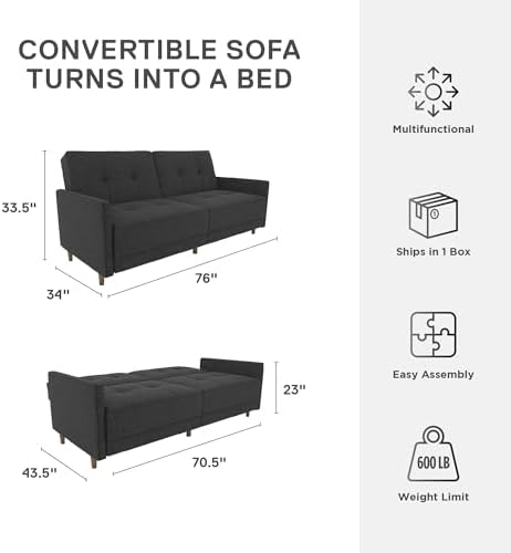 The mid century modern look is making a comeback in a big way, and we’ve captured it all here for you in our stunning and or a coil futon. The tufted upholstery gives this futon its unique charm, available in your choice black or white faux leather, as well as in grey or navy blue linen—perfect to fit your Home’s décor! plus the sleek wooden legs add to the sofa's style, with center legs designed to provide extra stability. The sofa's Secret is its split back design that allows guests to adjust their angle of comfort. So you can each sit up, lounge back or open up the space to lie flat. The independently encased coils are designed to offer complete comfort by day and extra support at night when your futon opens up for overnight guests. The and or a is small enough for tight living spaces while providing you with big style and comfort!.
