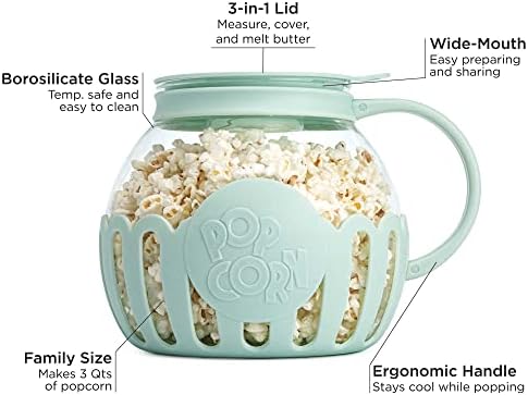 Product is perfect size for one hearty serving. Consistently pops all the kernels (assuming you don't overload it). Haven't had a single burnt popped kernel yet. The lid has holes for butter to melt through during popping; however, the butter melts completely before the popping starts, then pools at the bottom to become a dark brown coating on the glass (hence 4 stars rather than 5). Better to melt the butter separately and add it to the popcorn later.Plus, it's just darn cute.