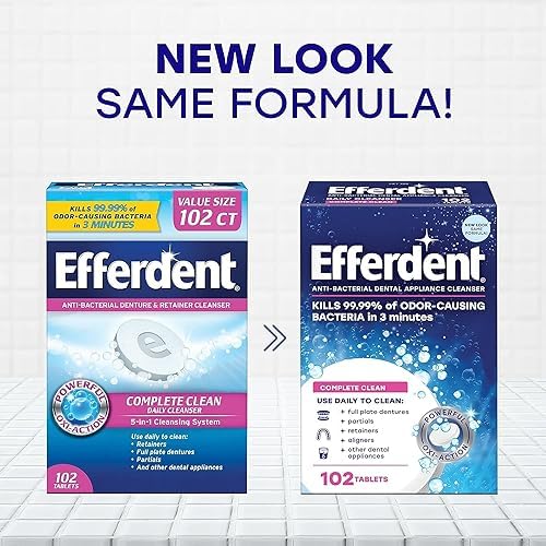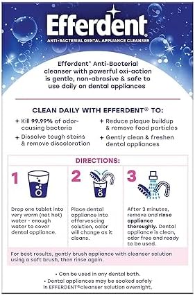 You'll smile with confidence knowing that your teeth and gums are clean, bright and healthy. Efferdent Complete Clean cleaner tablets provide an everyday, odor-free clean. Efferdent’s Oxi-Action cleaning tablets give a complete clean by eliminating the most stubborn stains in hard-to-reach places.