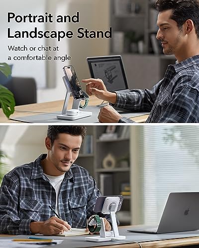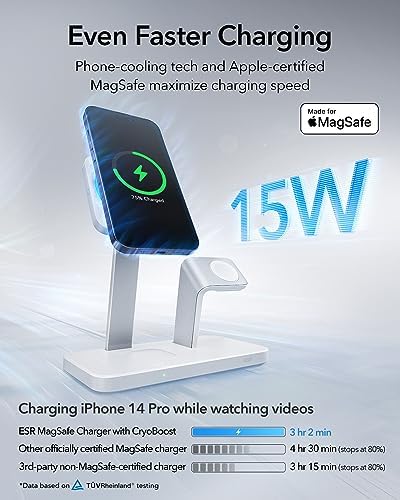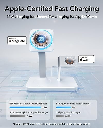I recently got my hands on the ESR 25W 3-in-1 Charger Stand for MagSafe and it has completely changed the way I charge my Apple devices. I have used it for a little over a week now and this is the best charging stand I have ever owned. It is perfect for anyone who owns an iPhone compatible with MagSafe, Apple Watch, and AirPods with MagSafe. I cannot express enough how impressed I am with this product, and here's why:Sleek and Stylish Design: The first thing that caught my eye was the elegant and minimalist design. The charger looks fantastic on my nightstand. I do wish it would be offered in the color black as that fits my preference but it still looks great.Compact and Space-Saving: One of the biggest advantages of this charger is that it eliminates the clutter of multiple chargers and cables. It's compact and takes up minimal space, making it an ideal choice for those with limited space. Plus, it helps me keep everything organized and tidy.Efficient Charging with Cryoboost: When it comes to charging, this 3-in-1 charger doesn't disappoint. It charges my iPhone, Apple Watch, and AirPods simultaneously. It's incredibly efficient, and I love the fact that I can start my day with all my devices fully charged. The Cryoboost function allows for the phone to stay cool while charging. This feature was a big selling point for me and why I chose it over other 3-in-1 chargers. I have the new iPhone 15 Pro Max fitted with the Otterbox Symmetry Series Case with MagSafe. It charges my phone perfectly. When you place the phone on the charger, a blue light illuminates from within the charger and a built-in fan blows cool air on the back of the phone. There is also a white indicator light on the base of the charger. This charger does allow you to turn off the blue light, fan, and white indicator light. This is great for all of us who prefer our rooms to be completely dark at night. The fan isn’t really loud and I wish there could be an option to just turn off the lights and keep the fan engaged while the phone is charging.Apple Watch Charging: The potion of the stand made for the apple watch is magnetic and helps seat the watch to ensure it stays in places and charges appropriately. It works great!AirPods Charging: The designated spot for my AirPods Pro 2nd generation is perfect. That spot is magnetic to help keep your AirPods in place and gives me that peace of mind that they will be fully charged when I need them again. I did also buy the ESR AirPods Pro 2 (HaloLock) case to protect my AirPods. That case has magnets built into the back of it and it really gives that extra security on the base station to ensure they don’t move off the charger by accident.Quality Build: The charger feels sturdy and well-made. You are able to take your phone, watch, and AirPods off of it without it moving or shifting which I really appreciate. It gives me confidence that it will last a long time, which is essential for a device I rely on daily.Value for Money: Considering the convenience and functionality it offers, I believe this charger is an excellent value for the price. It simplifies my charging routine and keeps my devices in top-notch condition.In conclusion, this three-in-one charger for iPhone, Apple Watch, and AirPods has become an essential part of my daily routine. It combines style, convenience, and efficiency in one sleek package. I highly recommend investing in this charger. It's a game-changer that will make your life easier and your charging setup more organized.