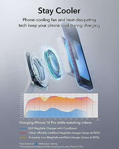 CryoBoost's phone-cooling fan and heat-dissipating components keep your phone below 98°F during charging while other MagSafe chargers heat your phone to over 108°F. This cooling protects your battery, keeps charging speeds at their maximum, and ensures your phone stays cool to the touch.