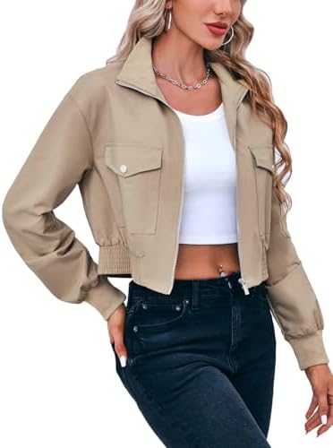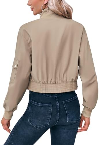 Fisoew Women's Cropped Bomber Jackets Lightweight Zip Up Stand Collar Long Sleeve Short Jacket with Pockets