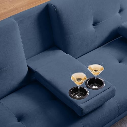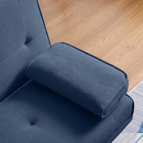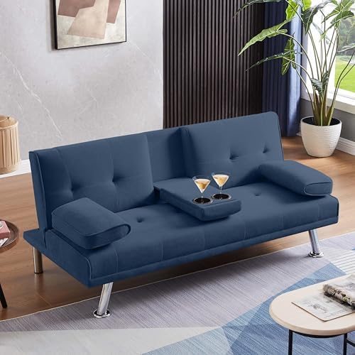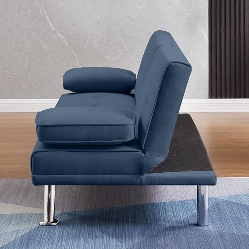 Folding Futon Velvet Sofa Bed Adjustable Couch Sleeper for Living Room Stainless Steel Frame and Feet with 2 Cup Holders,Removable Armrests (Dark Blue)