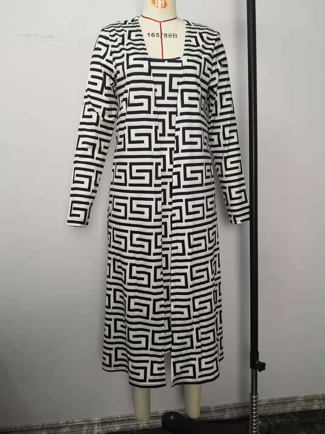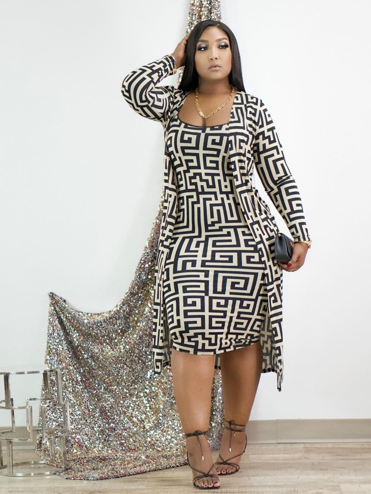 geometry Print Women's Set Long Sleeve Long Cloak Tops Bodycon Midi Dress Two Piece Matching Set Outfits femme y2k
