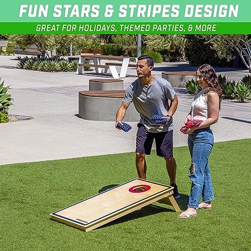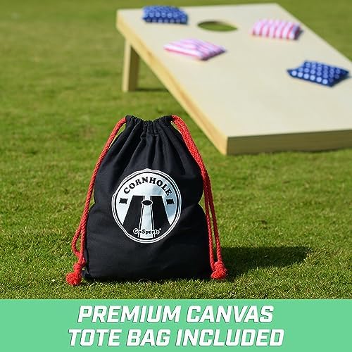 This set of GoSports premium all-weather duck cloth official cornhole bean bags is a maximum value priced alternative compared to other overpriced sets that don't hold up to the demands of Cornhole gameplay. As you continue to toss this set of bean bags season after season you will have the satisfaction every buyer loves to feel - getting more than you paid for! That's because this premium duck cloth material comes professionally double stitched for tear-free gameplay and the weather-proof plastic filling keeps this set working even in the rain. Even diehard Cornhole players love the plastic filling that feels just like the original corn filling, but now without having to deal with mold, decay, and attracting critters! This long lasting value set even meets the regulation size and weight standards for Cornhole so you can use them in tailgating, camping, practice, competition, and just at home. As an added bonus, this GoSports Bean Bag Set comes with a convenient tote bag to carry and store your set until the next game. You won't find such a great bundle deal anywhere else!