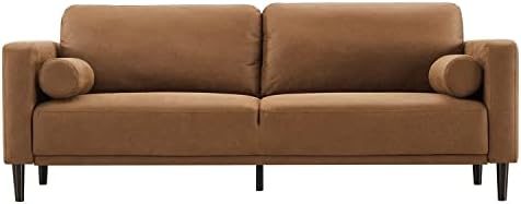 -- With its classic yet timeless brown tone and sleek, minimalist design, this 79" loveseat sofa anchors your space in mid-century modern style. Natural color variations, wrinkles and creases are part of the unique characteristics of this faux leather couch fabric that is built to withstand everyday wear and tear.