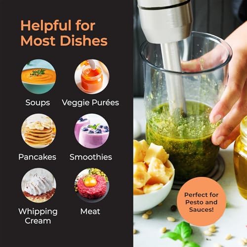 This Mueller Hand Blender features durable materials and all the accessory attachments you need to mix and blend like a pro at home. The stainless steel blending shaft features an ultra-sharp blade to whip, mix, and blend your favorite desserts, breads, soups, and side dishes.