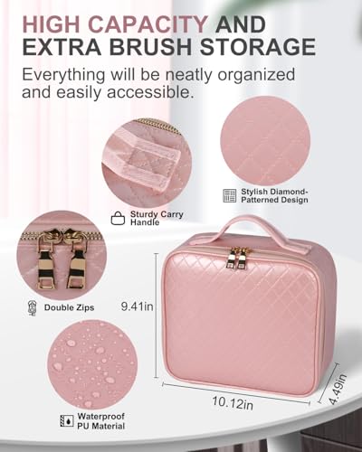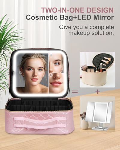 Makeup Bag with LED Mirror and Travel Makeup Train Case Cosmetic Organiser with 2X3X Magnifying Mirror and Separate Makeup Brush Panel, Portable Adjustable Divider Storage Bag, Pink