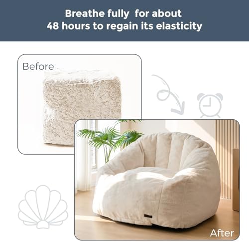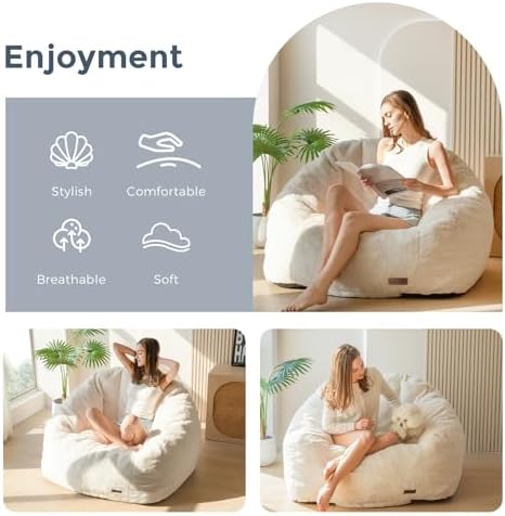 If you were to ask me how I feel about this chair, I would say it's pretty great. But if you were to ask me on a deeper level... I would say this is the most comfortable chair I've ever had the pleasure of sitting on. It is literally one of my prized possessions. Everyone who comes to my house fights over who gets to sit in it, and then they rave about how cute AND comfortable it is. Overnight guests literally ask if they can sleep on it, and our cat does sleep on it, constantly. It feels like being cradled in the giant arms of a friendly yeti.Okay, but for real, this chair is exactly what I was looking for! I like to curl up while reading. I knew I wanted something big and cushy for my reading chair, but I still needed some back support, so I wasn't craning my neck or having to hold my book up to read. This chair is perfect for that! It's seriously like a cozy little nest. I have fallen asleep sitting in it multiple times (hence the embarrassing photo my husband took).Literally no matter how you sit in it, it's comfortable. Upright, sideways, even upside down, haha. I usually sit sideways so I can tuck my legs up. The back is supportive even when it's pulled away from the wall, and it has stayed sturdy in the 4 months we've owned it. After a while, the seat does start to sag, like any beanbag. We just flip it over and leave it upside down overnight when that happens, which works like a charm. The faux fur is so soft, and it doesn't have that icky microfiber feeling. Also, our cat's fur doesn't cling to it, and it seems to wipe clean just fine.The chair came vacuumed sealed and expanded pretty quickly, but it probably took about 2 days to fully fluff up. We beat it up a bit to break up the foam chunks, which helped. It did have a smell for a couple days, which aired out. Because of the way this chair is designed, you can't remove the cover to wash it, but that hasn't been an issue for us yet (even with a baby).Overall, I'm obsessed with this chair and I highly recommend it for fidgety readers, or anyone looking for a super cozy chair!