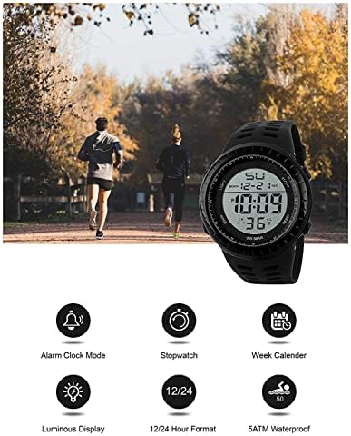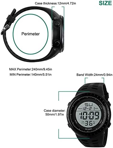 Main Features: - LED digital military watch designed for men. - Equipped with alarm, day, date and stopwatch function. - Can see the time clearly in the dark with back-light. - Taiwan IC chipset, time goes precisely. - Imported PC case and highly transparent resin mirror, sturdy in structure. - PU band and highly transparent resin mirror, soft to wear. - 5ATM water resistant is convenient for daily life. - This is a good present for your relatives and friends. About Water-resistant Watches Water Resistant Watches are sealed to withstand some pressure. Water resistance is tested in measurements of atmosphere (ATM). Each ATM denotes 10 meters of static water pressure. This is not the depth to which a watch can be worn. Many watch cases will list the basic measurement of 1 ATM as "water-resistant." These watches will withstand small splashes of water but should not be worn while washing the hands or submerging the hands in water. Remember, water resistance is tested under static conditions. Wearing a watch which is 50 metres water resistant to water will expose the watch to a much greater pressure than during a 50-metre static test. Therefore the number of metres shown on the watch does not indicate the depth that the watch can be taken to. Here is a general guide 50M = 5ATM = Shower Proof - it's ok to get it wet a bit. 100M = 10ATM = Extended Water Exposure good for swimming or snorkeling. 200M = 20ATM = Pressure Resistant made for Scuba and Skin Diving.