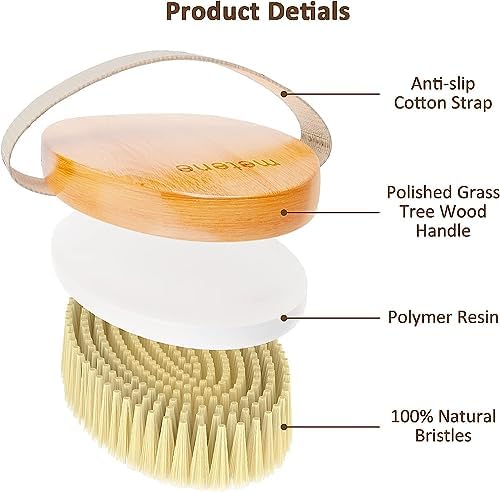 Works great, bristles are stiff but still soft and comfortable to use. I use this brush for dry brushing my skin prior to showering. Works great and makes a huge difference for exfoliating my skin, especially helpful for preventing ingrown hairs from shaving. Definitely recommend!