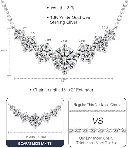 Brand, Seller, or Collection Name N9NEMUSES Material 18K White Gold Gem Type Moissanite Setting Prong Item Length 1.38 inches Chain Cable Clasp Spring Ring Number of stones 12 Stone Weight 5.00 carats Model number 9M-NC-MS-SMILE-5CT Certificate number Exclusive Certificate type GRA