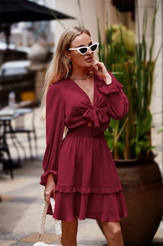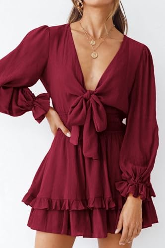 PRETTYGARDEN Women's Short A-Line Flare Dress Knot Front Long Sleeve V Neck Tiered Ruffle Swing Mini Skater Dresses