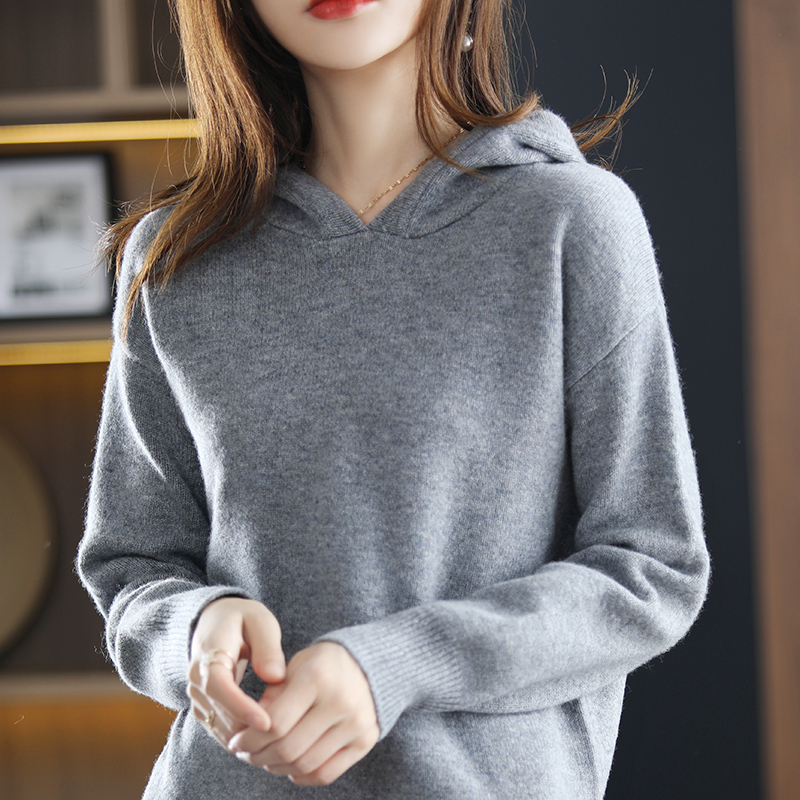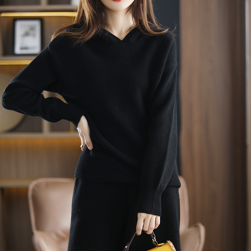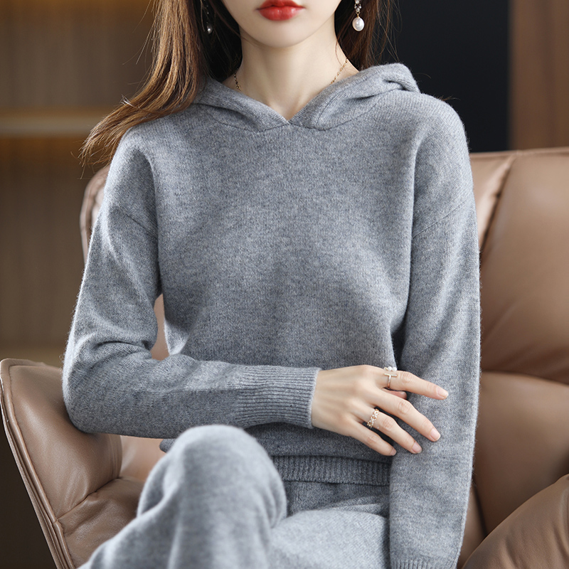 pure wool suit ladies hooded collar pullover casual plus size top loose wide-leg pants trousers winter two-piece suit