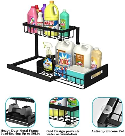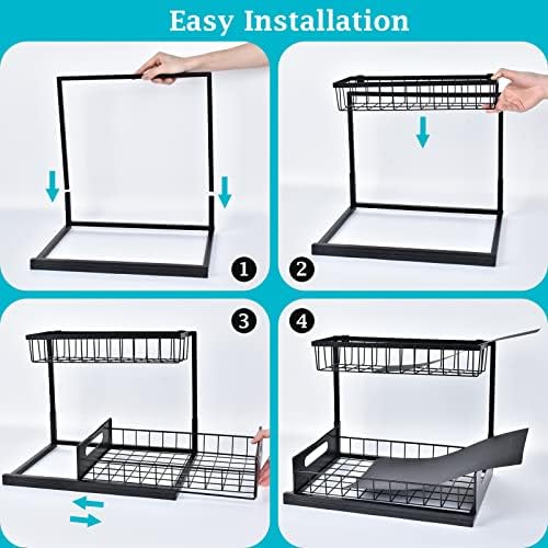 Under sink organizer ideal for sinks, bathrooms, kitchens, pantries, and offices. Can be used as bathroom toiletries storage, kitchen spice rack or office supplies rack, etc. Make Your Home More Organized and Beautiful.