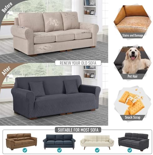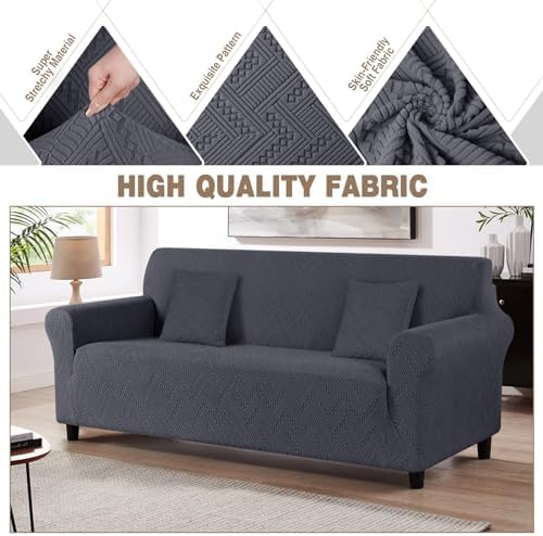 This 3-seater couch cover has exceeded my expectations in every way. The stretchy material fits snugly, conforming perfectly to my couch, showcasing its exceptional flexibility.The deep blue-grey color is stunning, adding a touch of elegance to my living room. The soft Jacquard fabric feels luxurious and durable, ensuring durability and comfort. Plus, the non-slip backing keeps the cover securely in place, eliminating worries about shifting or slipping. The elastic band ensures a smooth, tailored fit, accentuating the sleek design.