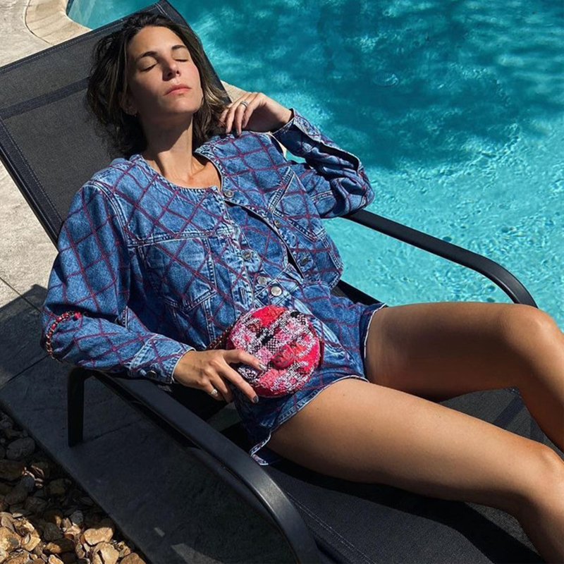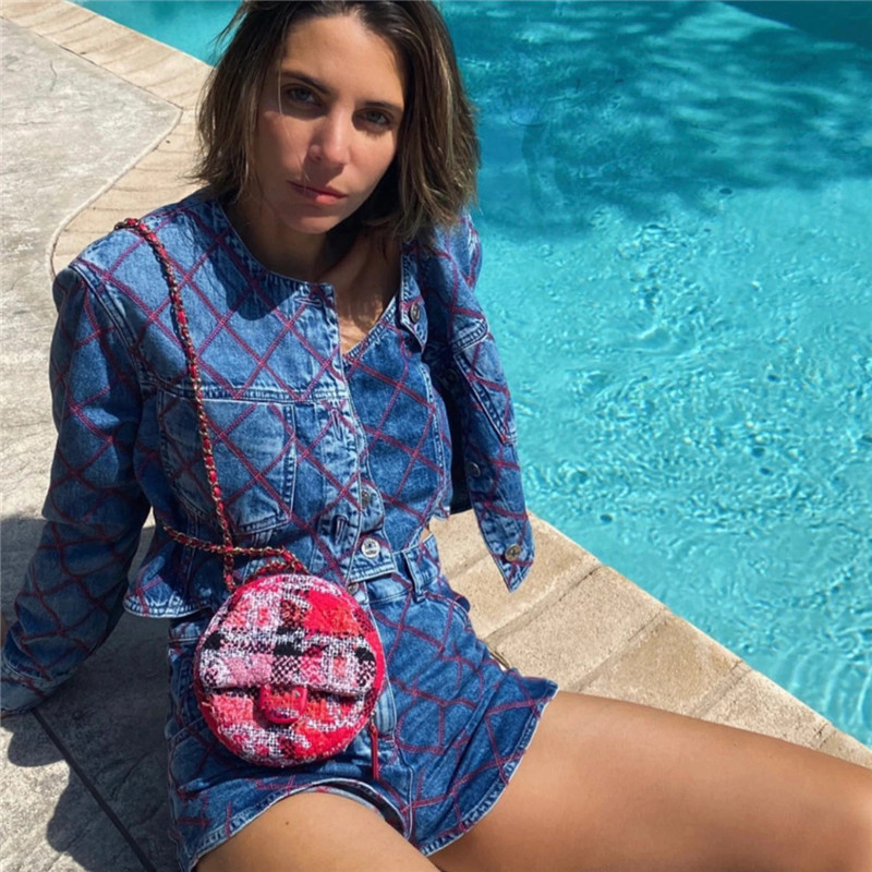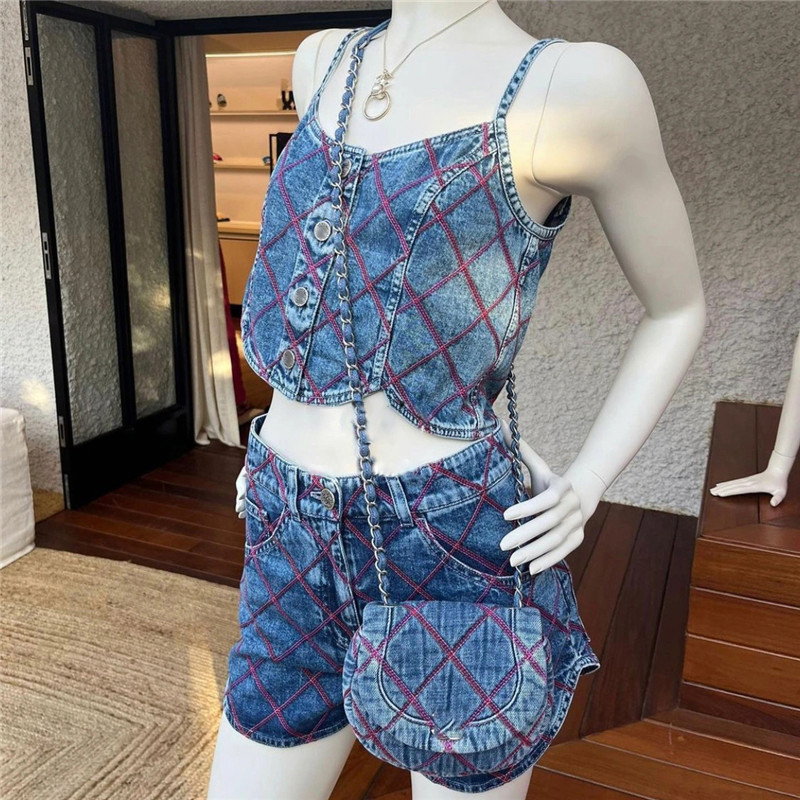 sense long sleeve short denim jacket women's Plaid suspender Top High Waist Shorts suit