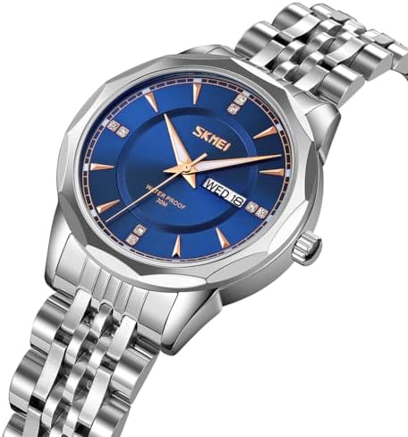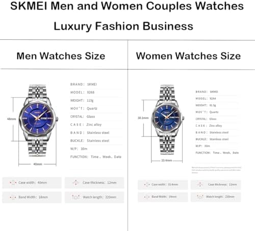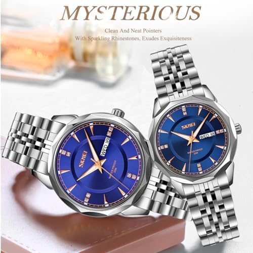 SKMEI Pair Watches for Couples Men and Women His and Hers Watch Set Husband and Wife Valentines Matching Wedding Gifts Stainless Luxry Business Blue Wrist Watch