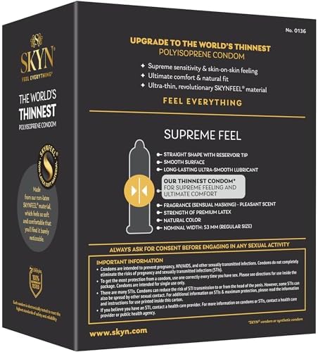 My girlfriend stopped BC a year ago and we have to resort to condoms, which I personally do not like just like most others. I have tried almost every “thin” condoms with her. I can say Skyn has by far been my favorite. Prior to Skyn Supreme Feel, I used Skyn Elite (36 pack) and I thought Elite was really thin and reliable. After we ran out, I purchased the Skyn Supreme Feel and I am extremely impressed. We have used about 20 of them so far if not more, so I can definitely say what I believe in them. It is incredibly thin like it’s not being used. It’s also super reliable for us. I haven’t had any break in the midst of what we’re doing. This is my go-to condom for sure!