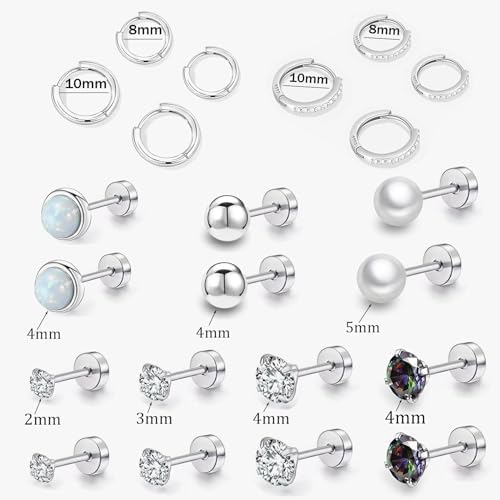 11 Pairs Surgical Steel Flat Back Studs and Sterling Silver Huggie Hoops