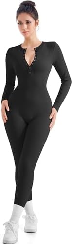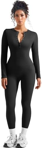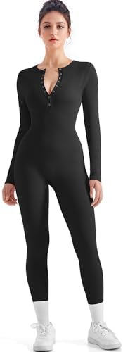 SUUKSESS Women Long Sleeve Ribbed Workout Jumpsuit One Piece V Neck Button Down Yoga Jumpsuits