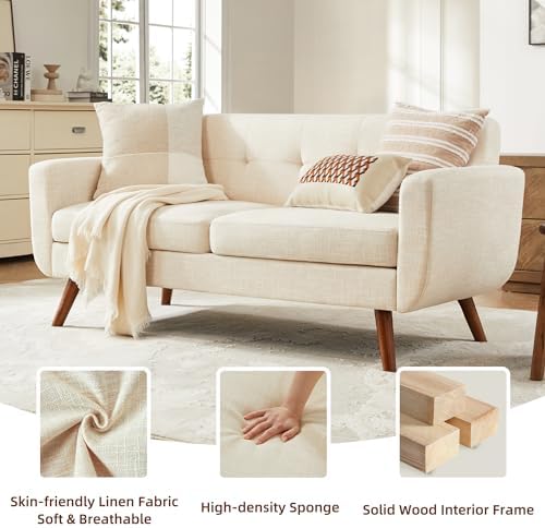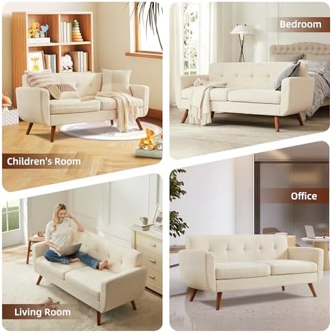 Tbfit 65" W Loveseat Sofa, Mid Century Modern Decor Love Seat Couches for Living Room, Button Tufted Upholstered Small Couch for Bedroom, Solid and Easy to Install Love Seats Furniture, Beige