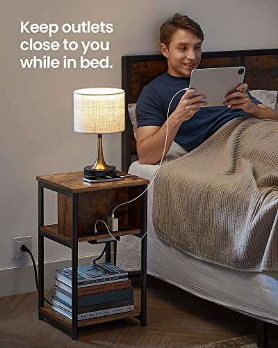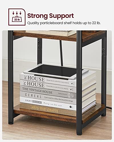 VASAGLE Side Table with Charging Station, 3-Tier End Table with USB Ports and Outlets, Nightstand for Living Room, Bedroom, 11.8 x 13.4 x 22.8 Inches, Plug-in Series, Rustic Brown and Black