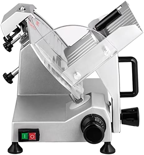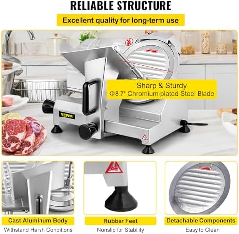 This food slicer is made of cast aluminum body and 8.7'' chromium-plated steel blade, with a painted surface, corrosion and rust-proof. The 240W powerful motor provides high-efficient production. An equipped regulator can adjust the thick of slicers between 0-0.47 inch/0-12 mm. It adopts a detachable design for easy cleaning. It is a perfect turkey deli meat slicer, bread slicer, deli slicer, and salad shooter.