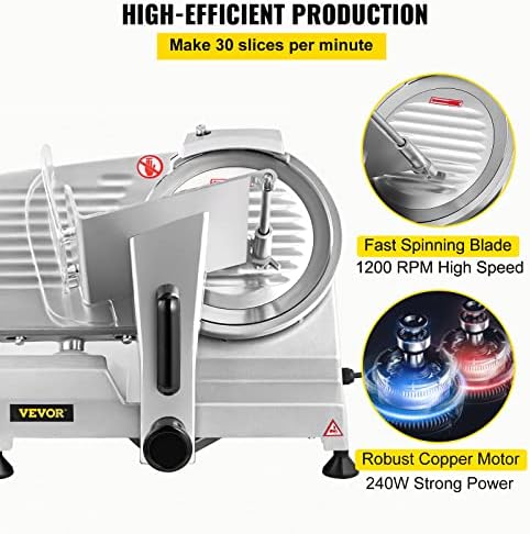 Our meat slicer machine adopts a strong motor with 240-watt input power, bringing the blade with 1200RPM rotating speed. It allows you to slice 30 pieces of food every minute, saving you a lot of time and energy.