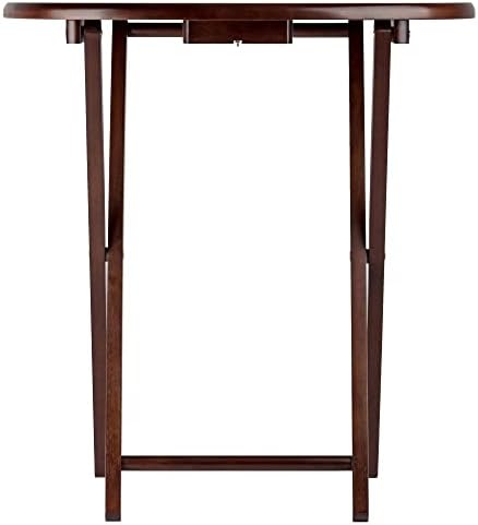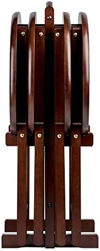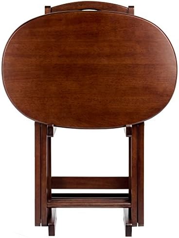 Make entertaining simple and easy with the Winsome Wood Nathan 5-Piece Snack Table Set. This versatile set includes four tables and for convenience a storage rack to store your tables out of the way when not in use. The oval shape of these snack tables makes these distinctive and stylish. Ideal for setting out appetizers at a party, enjoying a meal while relaxing on the sofa, or for working on your laptop. This set of foldable tables open up to X-frame bases which make these table not only look good but also help with stability. Tables easily open up, with a wood stopper on the other end helping the legs stay standing. Great for daily use and compact enough to store in the closet. Constructed of solid wood, the rich cappuccino finish brings out the warmth of the wood grain. Conveniently packed and shipped in 1 box. Tables arrive ready to use and require no assembly. Minimal assembly is required for stand. Replacement part request can be submitted directly to the manufacturer within 60 days from date of purchase. Individual Table Size: 20.7"W x 15.8"D x 25.5"H (open) Individual Table Size (closed): 20.7"W x 2"D x 29"H Dimensions of Stand with tables stored: 23.7"W x 12.9"D x 31.3"H Static Maximum Weight per Table: 25 lbs. Tables come fully assembled Storage Stand requires assembly Ships in 1 box