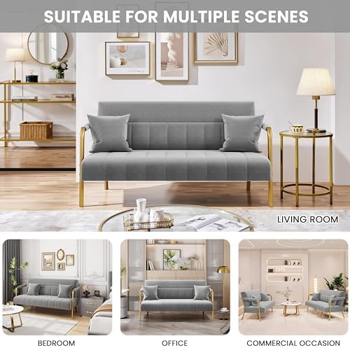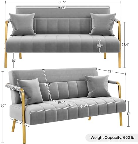 Introducing acompact upholstered loveseat, measuring 56.5″ W × 28″ D × 30″ H (143.5cm W × 71.5 cm D × 75.5 cm H), designed to offer comfortable and softseating without overpowering small spaces. Built with a CARB-compliantengineered wood frame, sturdy metal legs, and luxurious velvet fabricfor stability and durability, it features a slanted backrest, deepcushioned seat, and velvet fabric-covered armrests for relaxation. Theplush velvet fabric and high-density foam ensure long-lasting comfortand support. Variousavailable upholstery colors collocate with gold metal legs, this smallcouch will be a wonderful addition wherever it's used, including but notlimited to the living room, bedroom, home office and other nooks of yourapartment or house.