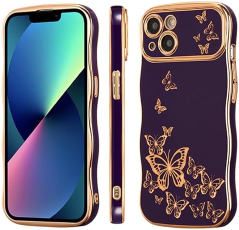 ZTOFERA for iPhone 13 Case for Girl Women, Cute Curly Wave Frame with Luxury Plating Butterfly Pattern, Soft TPU Gold Edge Shockproof Raised Lens Protection Phone Case for iPhone 13, Dark Purpledummy